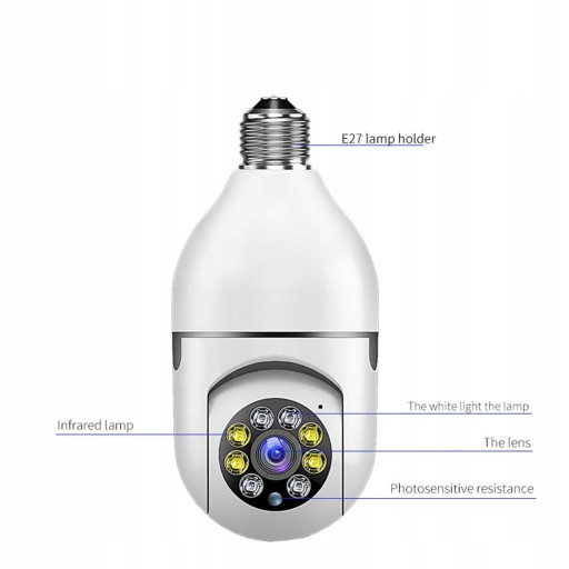 Łatwa instalacja: kamerę uchwytu lampy można zainstalować ze standardową podstawą żarówki E27 (110 V-240 V). Musisz pobrać aplikację. Za pomocą aplikacji możesz podłączyć kamerę do Wi-Fi. Uwaga, pierwsze podłączenie kamery do wifi zajmie około 40 sekund.