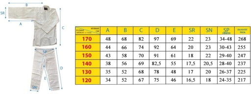 - Rozmiar: 120cm (wymiary w tabeli - mierzone na kimonie rozłożonym na płasko)