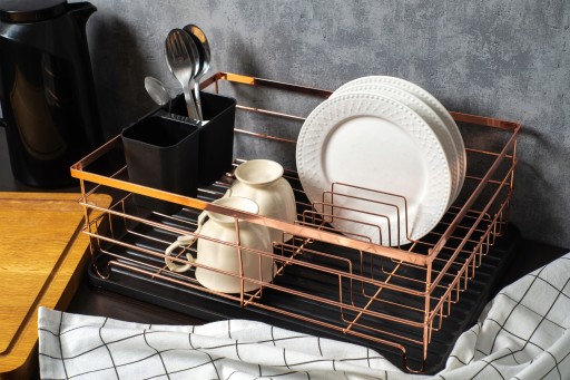 - Zamów teraz Suszarkę do naczyń metalową w kolorze miedzianym z tacką z tworzywa w kolorze czarnym i ciesz się pięknem oraz praktycznością tego produktu w swojej kuchni!