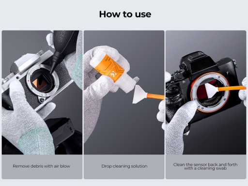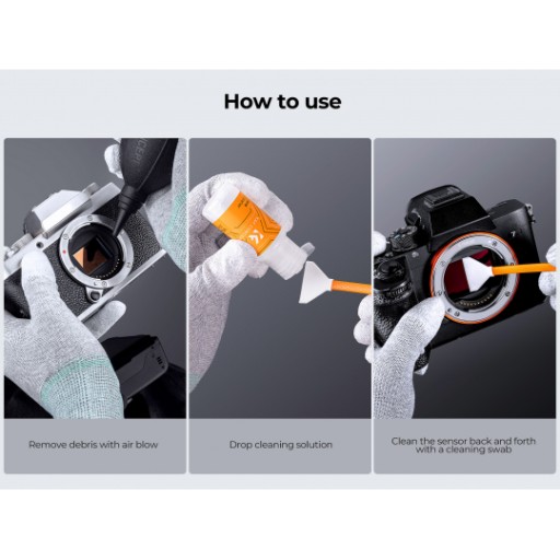 Czyszczenie matrycy pełnoklatkowej z zestawem K&F Concept jest szybkie, bezpieczne i wygodne. Cały proces to zaledwie 3 proste kroki: