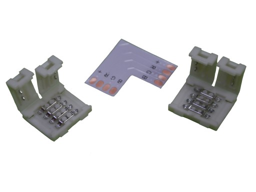 Złączka kątowa czteropunktową typu klips do łączenia taśm LED 5050 RGB o szerokości 10 mm.
