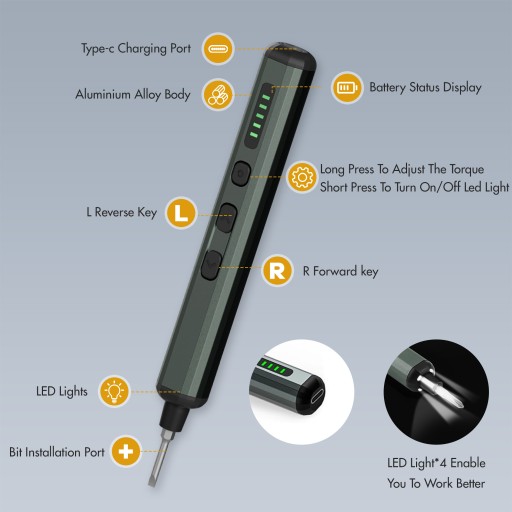 Ten czuły wkrętak elektryczny ma 5 poziomów momentu obrotowego od 0,12 Nm do 0,35 Nm. Można wybrać żądany moment obrotowy za naciśnięciem przycisku. Zapewnia precyzyjny moment obrotowy dostosowany do rzeczywistych potrzeb pracy. Idealny do tabletów, telefonów komórkowych, zegarków, bransoletek elektronicznych, aparatów fotograficznych, precyzyjnych instrumentów, zdalnie sterowanych zabawek, dronów i innych.