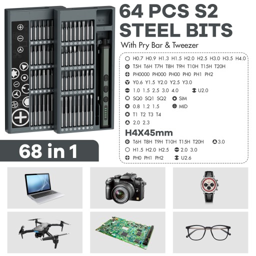 Mini śrubokręt elektryczny ma 68 bitów w 9 kategoriach, które pomogą Ci wykonać różnorodne zadania naprawcze. Stal hartowana S2 zapewnia długą i bezpieczną żywotność, a wysokiej jakości narzędzia pozwolą na wysoką jakość pracy.