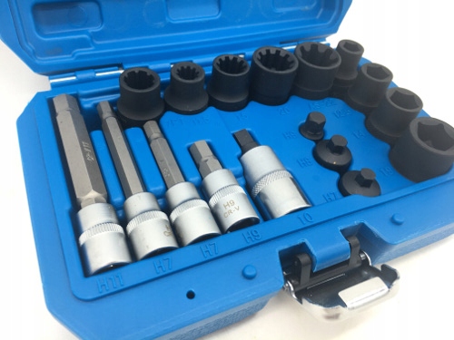 Zestaw zawiera 17 sztuk nasadek i zestaw bitów do zacisków hamulcowych.