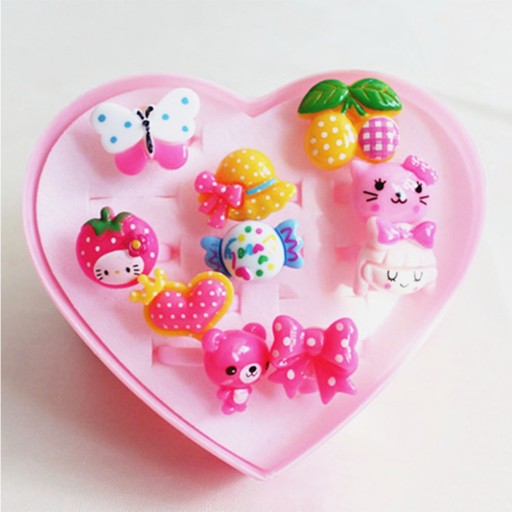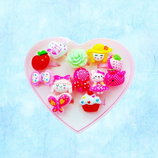 ✅12 pierścionków w gablocie w kształcie serca. Idealny zestaw biżuterii DIY dla dzieci.