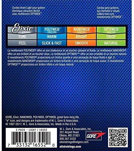 Zestaw Elixir 16552 Optiweb Light 10-46 to potrójny pakiet rewolucyjnych strun do gitary elektrycznej Elixir 19052, w których zastosowano innowacyjną powłokę OPTIWEB. Ta unikatowa technologia pozwala na zachowanie naturalnych odczuć podczas gry oraz klarownego brzmienia charakterystycznego dla strun niepokrytych powłoką.