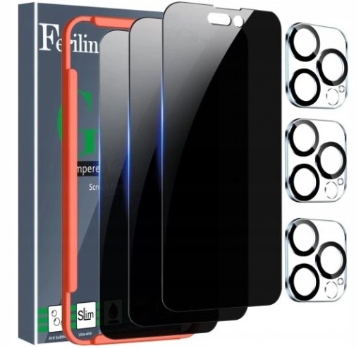 Szkło hartowane Ferilinso do iPhone 14 Pro Max wysokiej jakości zapewnia skuteczną ochronę ekranu przed zarysowaniami. Szkło ma funkcję antyszpiegowską. Zestaw zawiera 3 szt. szkła oraz 3 szt. osłony na aparat. Opakowanie może być uszkodzone.
