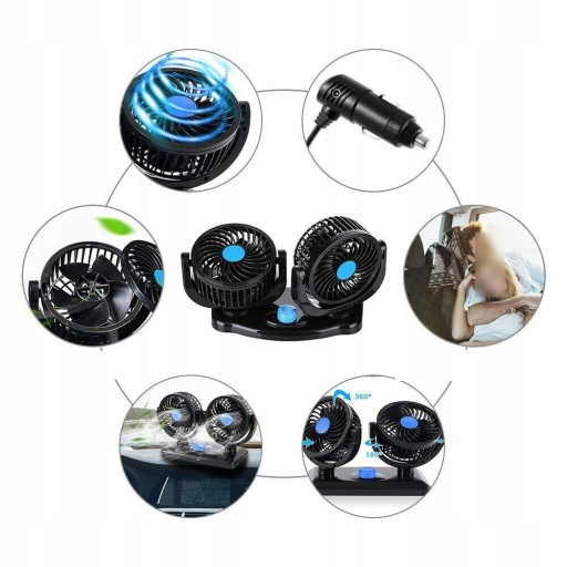 ✅ Obrót o 360°: podwójną głowicę można obracać o 360°, a podstawę wentylatora można obracać o 180°, aby poprawić przepływ powietrza i zapewnić chłód w samochodzie.