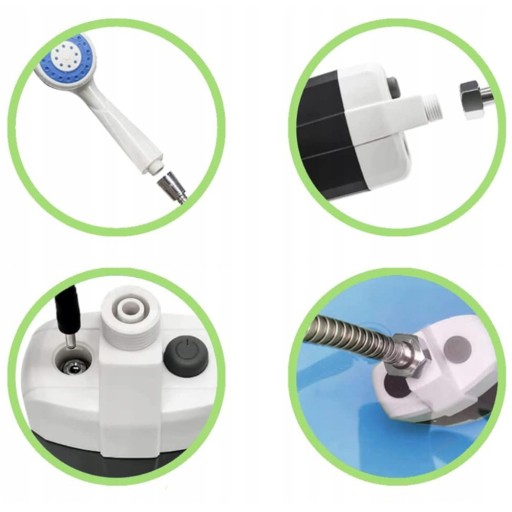 Prysznic kempingowy jest bardzo łatwy w użyciu, wystarczy podłączyć pompę i głowicę prysznicową do węża. Całkowicie zanurz pompę w wodzie, a następnie naciśnij przycisk na baterii, aby aktywować urządzenie i jesteś gotowy na prysznic. Praktyczny również na zewnątrz, idealny do czyszczenia w samochodzie i na kempingu.
