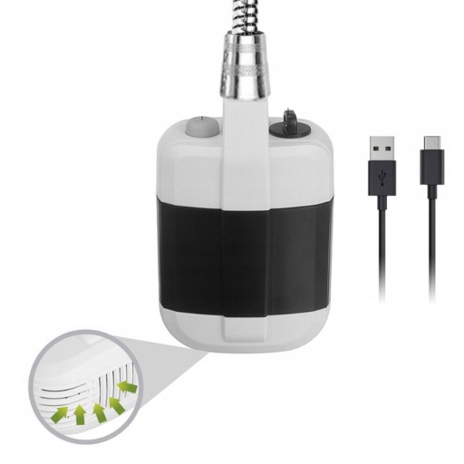Przenośny prysznic jest dostarczany z kablem ładującym do bezpośredniego ładowania przez gniazdko. Akumulator 2200 mAH zapewnia do 70 minut pracy i gwarantuje, że cała rodzina będzie miała wystarczająco dużo energii, aby cieszyć się wycieczką na kemping.