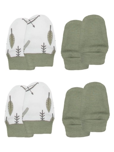 Rękawiczki, niedrapki 4 - pack uszyte ze 100% bawełny, posiadającej certyfikat Oeko-Tex Standard 100 Tekstylia godne zaufania. Występują w dwóch wersjach kolorystycznych. Pierwsze w kolorze zielonym, drugie białe w wzór indiański. Modele posiadają bezuciskowy ściągacz. Rękawiczki zabezpieczają noworodka przed zadrapaniem się.