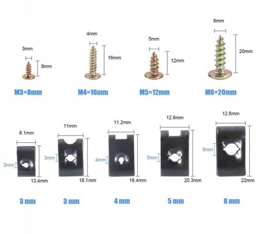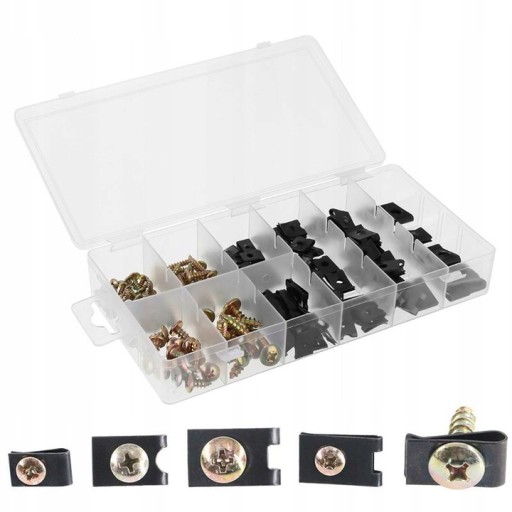 Zestaw składa się z 150 sztuk wkrętów i podkładek do karoserii, o rozmiarach od M3x8 mm do M6x20 mm. Wkręty i podkładki umieszczone są w wygodnym sortowniku.
