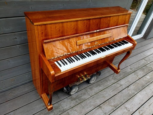 Bardzo dobry instrument renomowanej niemieckiej fabryki Sauter. Pianino z lat '60, ale zachowane w znakomitym stanie technicznym - zupełnie nie zużyte, niewiele grane i trzymane w bardzo dobrych warunkach. Sauter to fabryka założona w 1819 roku, do dzisiaj działająca i produkująca znakomite instrumenty (co oznacza, że można sobie kupić również fabrycznie nowe pianino Sauter zamiast używanego). Prezentowany egzemplarz ma 108cm wysokości, obudowę w jasnym kolorze drewna wykończoną lakierem poliestrowym na wysoki połysk oraz charakterystyczne dla lat '60 gięte nóżki pod klawiaturą, dzięki którym cała obudowa jest ładna i ciekawa stylistycznie. Jak każdy Sauter, także ten egzemplarz posiada mechanizm z firmy Renner'a, bardzo doceniany za precyzję wykonania i niezawodność. Pianino niewiele używane, stan podzespołów we wnetrzu jest znakomity, ślady używania niewielkie, praktycznie niezauważalne. Dźwięk mocny, głębokie basy, dość ciepły jak na europejską produkcję przystało. Mechanika jak to Renner pracuje bardzo przyjemnie. Instrument przeszedł serwis, naprawy i wszystkie potrzebne regulacje w naszym warsztacie. Jest nastrojony i gotowy do gry. Posiada moderator dzięki któremu można grać cicho.