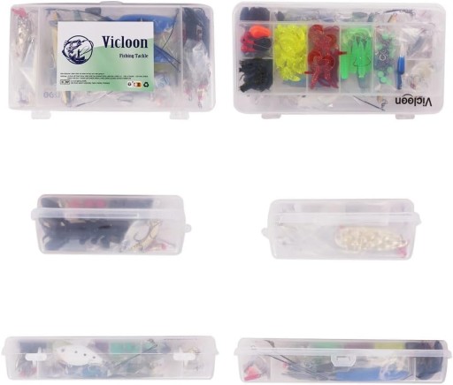 - Zestaw: 120 różnych przynęt, haczyków i spiningów