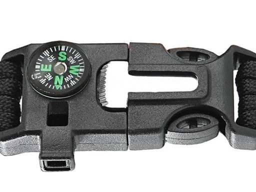 - W klamrze umieszczono krzesiwo, gwizdek dzięki któremu, będziemy mogli wezwać pomoc i blaszkę, która w razie potrzeby posłuży jako małe ostrze,