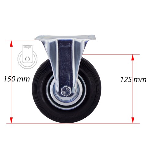 - OBUDOWY wykonane są blachy stalowej o dużej wytrzymałości. Płytka ma wymiary 102x84 mm. Kółka mają średnicę 125 mm, a centra mocowań mają wymiar 80 x 60 i owalne otwory do mocowania o wymiarach 14 x 9 mm. Wysokość całkowita wynosi 150 mm.