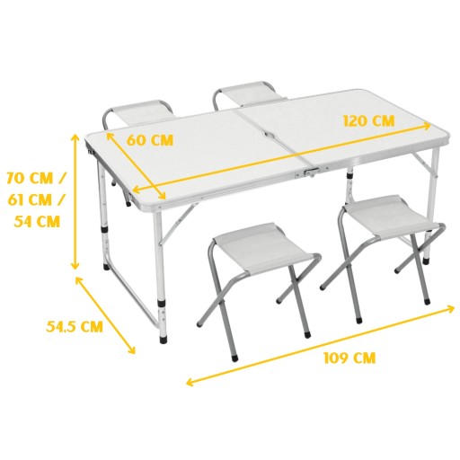 ✅ Zestaw składa się z regulowanego stolika i czterech składanych stołków, które zapewnią Ci wygodę, jakiej potrzebujesz, aby cieszyć się każdą chwilą spędzoną na świeżym powietrzu.