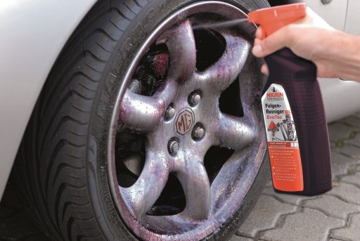 Rozpryskać środek na zimne i suche felgi. Indykator koloru wskazuje proces działania środka: zmienia swój kolor z niebieskiego na fioletowy w momencie rozpuszczenia zapieczonego pyłu hamulcowego. Po zmianie koloru na ciemnofioletowy można mieć pewność, że felga została wyczyszczona. Spłukać felgę myjką ciśnieniową i wysuszyć.