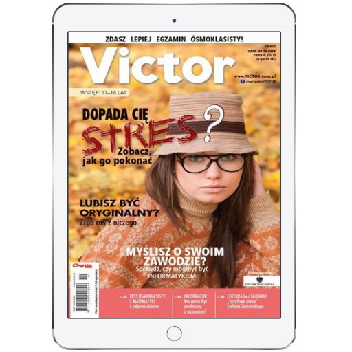 DWUTYGODNIK Victor to pismo edukacyjno-rozrywkowo-publicystyczne skierowane do młodzieży w wieku 1316 lat.- Część edukacyjna przydatna na co dzień w szkole i w domu, uzupełnia i utrwala wiedzę z zakresu przedmiotów humanistycznych, matematyczno-przyrodniczych, języków obcych. Dodatkowo w każdym numerze przykładowe arkusze egzaminacyjne.- Treści publicystyczne związane z tematyką młodzieżową, poruszają aktualne problemy życiowe i szkolne nastolatków.- Kierunek zawód pomaga myśleć o wyborze kolejnych etapów kształcenia.- Orientuj się poszerza horyzonty, pozwala orientować się we współczesnej kulturze i sztuce.- Pismo daje też możliwość zaprezentowania własnej twórczości i osiągnięć młodzieży uzdolnionej artystycznie, literacko, sportowo, pokazania swojego regionu, miejscowości.Wśród współpracowników cenieni twórcy literatury młodzieżowej, znani specjaliści z zakresu psychologii i pedagogiki szkolnej oraz doświadczeni nauczyciele.