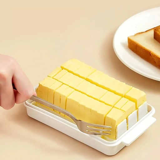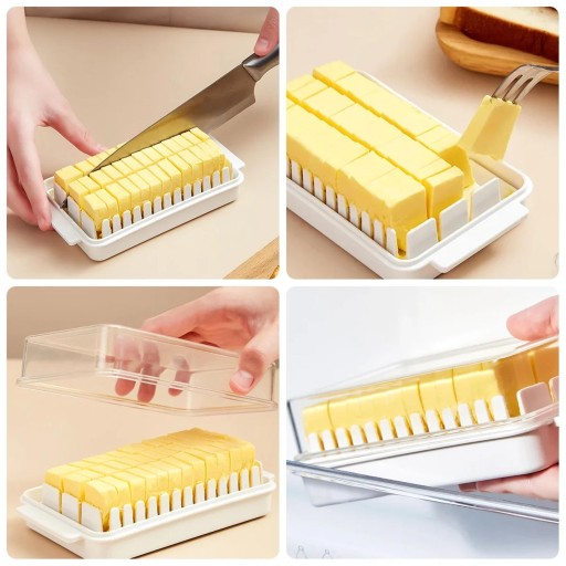 Pojemnik składa się z tacy, która na krawędzi ma rozmieszczone wypustki które pomagają pokroić masło na idealne kawałki.