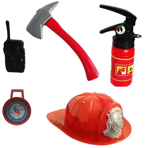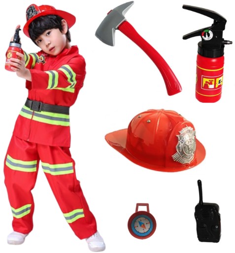 STRÓJ KOSTIUM STRAŻAKA MUNDUR KASK GAŚNICA KOMPAS KRÓTKOFALÓWKA 116 / 122 (120) ZESTAW