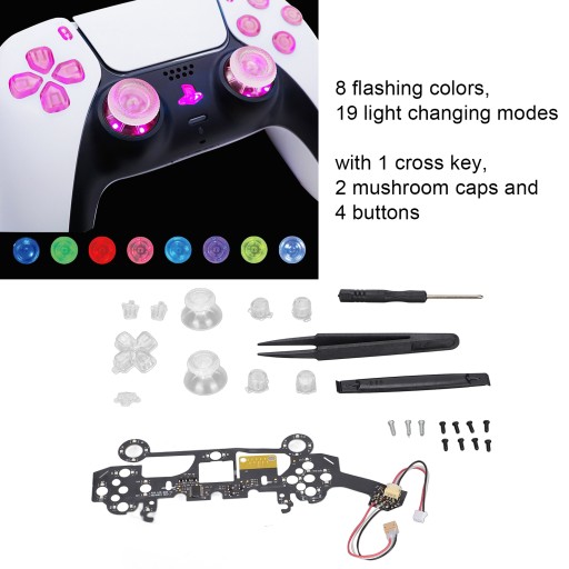 1、HIGH QUALITY MATERIAL: The accessories are made of high quality ABS material, which is sturdy and durable to ensure long erm use. 2、EASY INSTALLATION: Open your controller, glue and plug in, no soldering required. Button control, easy to operate. 3、COMPLETE ACCESSORIES: The set comes with a complete installation tool with 1 cross key, 2 mushroom caps and 4 buttons. 4、GOOD PERFORMANCE: 8 flashing colors, 19 light changing modes. The button changes into a light, which can be DIY and modified by yourself. 5、COMPATIBILITY: This wireless controller modified LDE light board is only compatible with for PS5 controller BDM?010, not for other controllers.