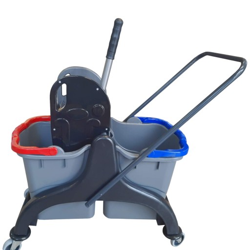 Wózek zawiera dwa duże wiaderka, uchwyty wiaderek są w różnych kolorach.