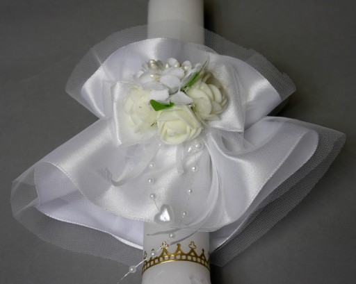 Rękawiczki białe oraz torebka komunijna satynowa prostokątna z trzech warstw tkaniny ( satyny ślubnej, sztywnego tiulu, podszewki satynowej) z koronkową delikatnie mieniącą się aplikacją oraz przypinką z kwiatków piankowych i satynowych. Torebka posiada sztywną wkładkę pomagającą w zachowaniu kształtu . Na życzenie przygotować możemy rękawiczki bez palców. Na pozostałych aukcjach można do kompletu dopasować okapnik oraz wianek.