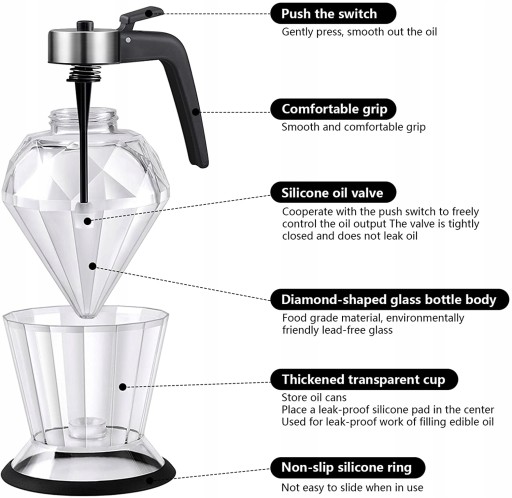 Dozownik oleju ze szkła diamentowego jest łatwy w obsłudze, bez skomplikowanego procesu, wygodny i wygodny. Wyjmij butelkę z uchwytu podstawy i naciśnij przycisk, aby uwolnić płyn w środku, czysty i łatwy w użyciu.