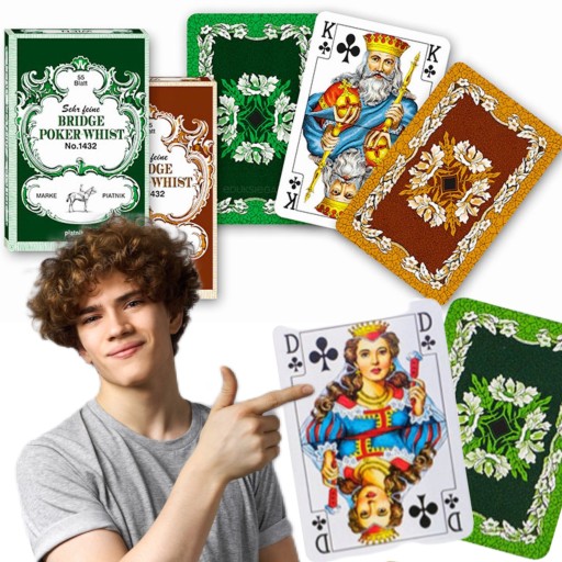 ✅ Na awersach kart znajdują się piękne figury, a na rewersach i opakowaniu charakterystyczne liście dębu w dwóch wersjach kolorystycznych - brązowej oraz zielonej.