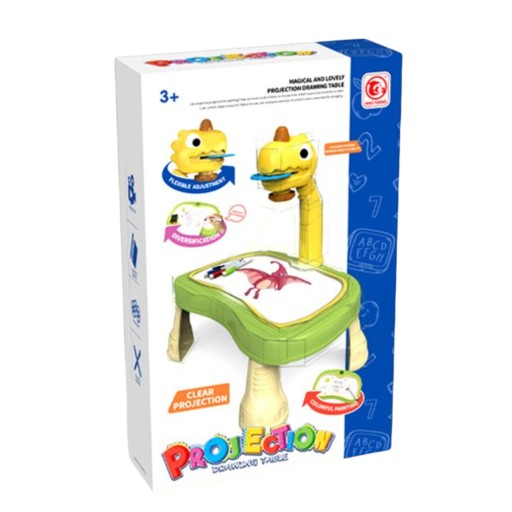 Ten unikalny stolik posiada wbudowany projektor, który umożliwia projekcję różnorodnych obrazów na powierzchni stolika. Dinozaur ma wygodny włącznik, służący do zapalenia światła, które stworzy odpowiednią atmosferę do twórczych eksploracji. Po włożeniu krążka ze slajdem, obrazy zostaną wyświetlone na podstawie projektora, dając dziecku możliwość odrysowywania ich w notesiku lub tworzenia bezpośrednio na podstawie.