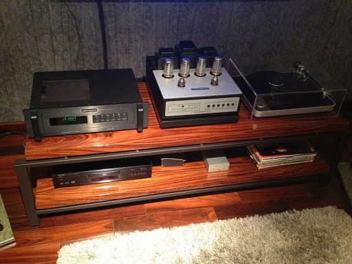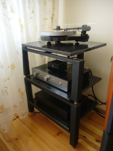 W zestawie kolce regulowane pod każdą z półek,i pod samym stolikiem(dodatkowo podkładki antyrezonansowe pod kolcami w nogach stolika)w celu odseparowania samych blatów dla maksymalnej minimalizacji drgań.