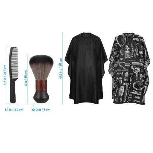 ✅ Rozmiar peleryny do włosów: 120 x 145 cm; Wymiary miotełki na szyję: 5 x 15 cm; Rozmiar grzebienia: 3,2 x 20,8 cm.