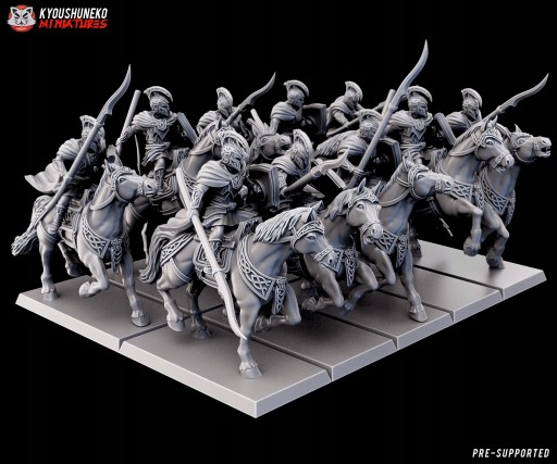 Przedmiotem oferty jest zestaw pięciu modeli High Elf Silver Cavalry od Kyoushenko Miniatures, wydrukowanych na drukarce 3D w technologii SLA.