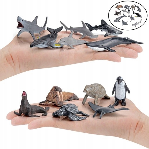 Ta figurka zwierząt morskich zawiera 12 elementów: delfin, lew morski, pingwin, rekin, żółw morski, płaszczka i mors, manat, żarłacz biały, humbak, rekin młot, płetwal błękitny, rekin wielorybi