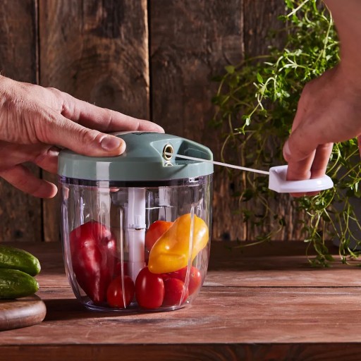 Siekacz działa bez prądu. Do napędzania noży wykorzystuje ręczny mechanizm sznurkowy. Możesz więc dobrze kontrolować stopień rozdrobnienia produktów spożywczych wrzuconych do jego przezroczystego pojemnika.