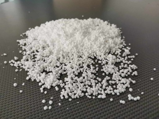 Regranulat z przemiału styropianowego, bez zanieczyszczeń. Jest zapakowany w worek i pudełko kartonowe.