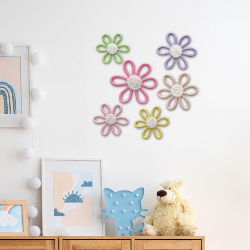 6 dekoracji ściennych z tkanych kwiatów stokrotki (1 sztuka 25 cm, 2 sztuki 20 cm, 3 sztuki 17 cm)