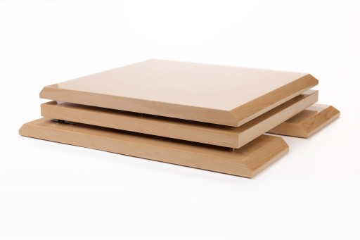 Platforma antywibracyjna z blatami o strukturze wielowarstwowej, pokrytymi naturalnym fornirem drewnianym (w prezentowanej wersji jest to drewno klonowe, wysoki połysk).
