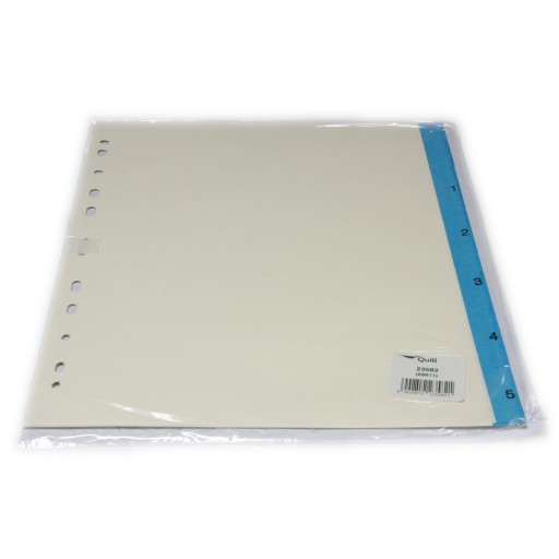 - niebieskie indeksy (prawa strona przekładki) z czarnymi cyframi 1-5