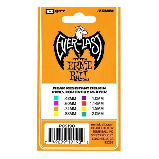 Zestaw dwunastu piórek gitarowych z serii Everlast. Wykonane z antypoślizgowego Derlinu. Grubość: 0.73 mm. Kolor: pomarańczowy.