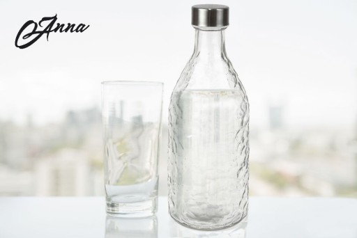 Szklana butelka o klasycznych kształtach. Nieregularna faktura butelki przypominająca rybie łuski ułatwia chwyt i nadaje jej unikalnego wyglądu.