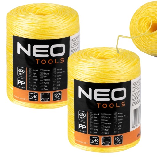 Sznurek polipropylenowy 250 m 49-932 marki NEO TOOLS to wytrzymały sznurek z polipropylenu o długości 250 mb w kłębku. Charakteryzuje się grubością nici tex 1850 oraz wytrzymałością (DAN) 41+/-5%. Posiada średnicę 15 cm oraz wysokość 15 cm. To lekki i wytrzymały sznurek NEO TOOLS, przeznaczony do podwieszania wełny mineralnej, podwiązywania roślin i pakowania. Może być wykorzystywany w przemyśle rolniczym, budowniczym oraz każdym gospodarstwie domowym.