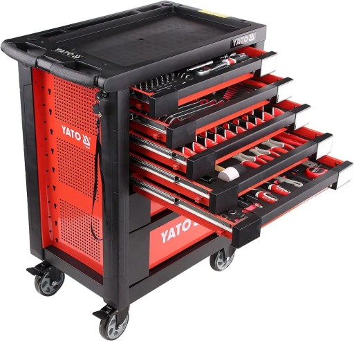 Szafka narzędziowa YATO Wyposażona jest w 7 szuflad na prowadnicach kulkowych 5 górnych szuflad zawiera 211 starannie dobranych narzędzi Profile wykonane są z podwójnej blachy stalowej - uniwersalna perforacja umożliwia doposażenie szafki w dodatkowe elementy Centralny zamek, oraz indywidualne zamykanie każdej szuflady Szafka posiada narożne odbojniki, które chronią przed przypadkowym uszkodzeniem np karoserii samochodu Blat wykonany z antypoślizgowego polipropylenu, koła z hamulcem Niezbędna w warsztatach samochodowych i stacjach obsługi pojazdów Ilość szuflad7 Rozmiar [cm]98x77x46,2 Ilość elementów [szt.]211