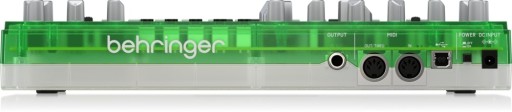 Behringer TD-3-LM analogowy syntezator linii basowej z VCO, VCF, 16-krokowym sekwencerem, efektami distortion i 16-głosowym poly-chain, kolor: zielony, przezroczysta obudowa