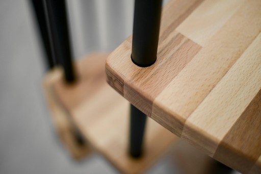 Stopnie z drewna bukowego, regulacja wysokości stopnia 19- 23,5 cm. Zestaw zawiera 12 stopni w zakresie wysokości 247- 305,5 cm.
