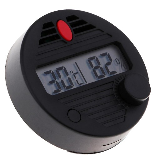 Okrągły higrometr cyfrowy z funkcją regulacji.