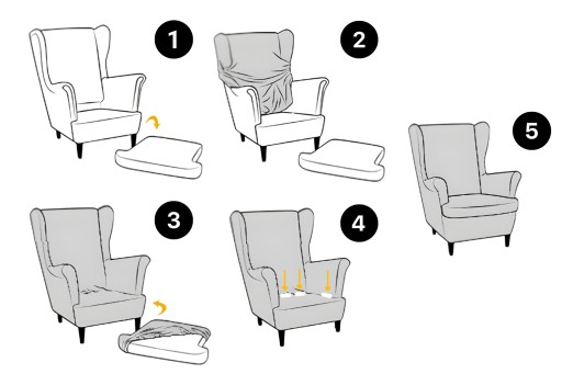 3️⃣ Równomiernie naciągnij pokrowiec na siedzisko i podłokietniki oraz nałóż pokrowiec na poduszkę.