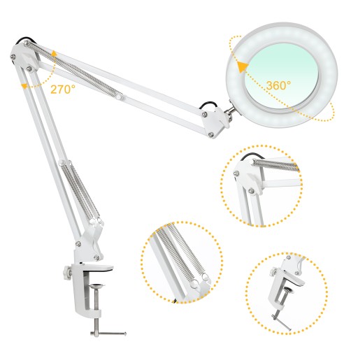 Szklana soczewka może być regulowana w górę i w dół o 270 ° i obracana o 360 °. Teleskopowe długie ramię zapewnia większą elastyczność. Ramię może być przedłużone do 270 cm, z 3 pokrętłami i 4 sprężynami. Regulując pokrętła, można utrzymać światło LED w żądanej pozycji bez łatwego przesuwania, uwalniając w ten sposób obie ręce. Metalowy klips może mocno przymocować lampę lupę, aby zapobiec jej przewróceniu. Nadaje się do biurek, stołów warsztatowych, półek, stołów itp.