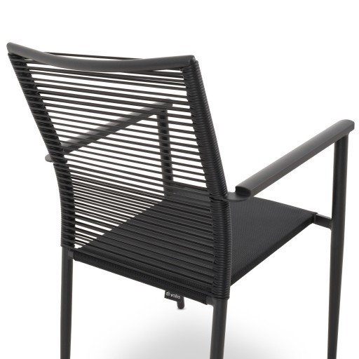 Siedzisko krzesła Codi wykonane zostało z tkaniny Textilene, która charakteryzuje się dużą wytrzymałością, odpornością na wilgoć i na płowienie pod wpływem promieni słonecznych. Materiał ten jest elastyczny, dzięki czemu dopasowuje się do kształtu ciała, ale jednocześnie nie rozciąga się, ani trwale nie odkształca wskutek użytkowania. Jego siateczkowa struktura sprawia, że jest przewiewny, co podnosi komfort jego użytkowania podczas upalnych dni.